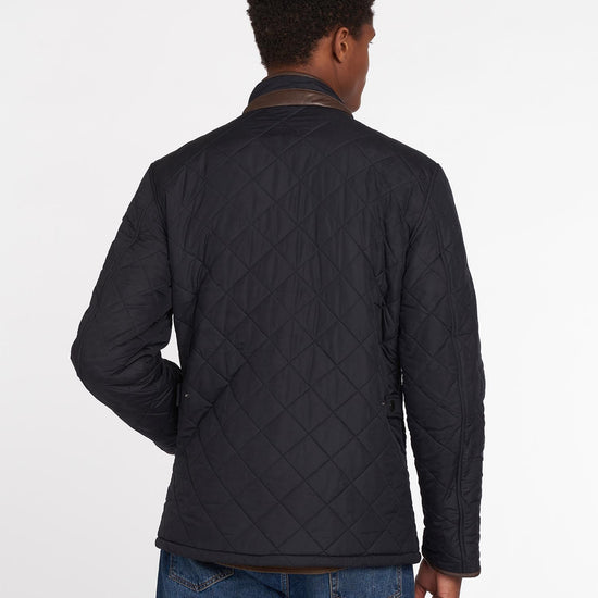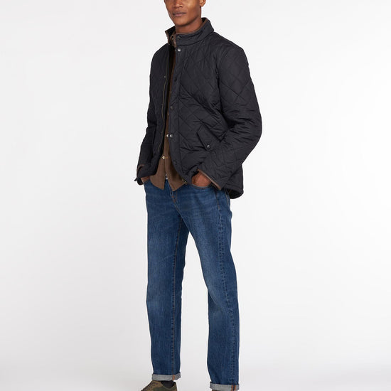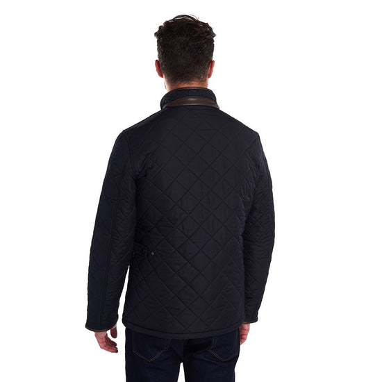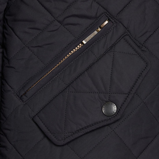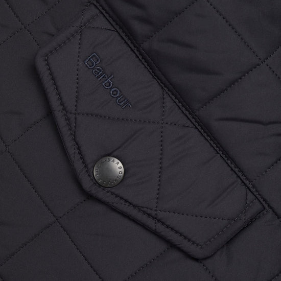 Built for the outdoors but without compromising on style, the Powell is a quilted Chelsea-style jacket that proves a firm favorite year after year. This timeless and practical fleece-lined jacket offers reliable warmth, thanks to the iconic quilted outer with 50g wadding and a super-insulating fleece lining. The two-way zip with Barbour branded ring puller fastens through to a corduroy-lined funnel neck, which can be closed with the robust stud fastenings for extra protection from wind and rain. A slimmer, contemporary shape gives a fashionable look, with back waist tabs for an adjustable fit that's ideal for essential winter layering. Two practical front pockets offer plenty of room to carry essentials, with an additional zipped pocket to safeguard valuables, a stylish synthetic leather trim finishes the collar and cuffs, and tonal Barbour embroidery trims the pocket flap.