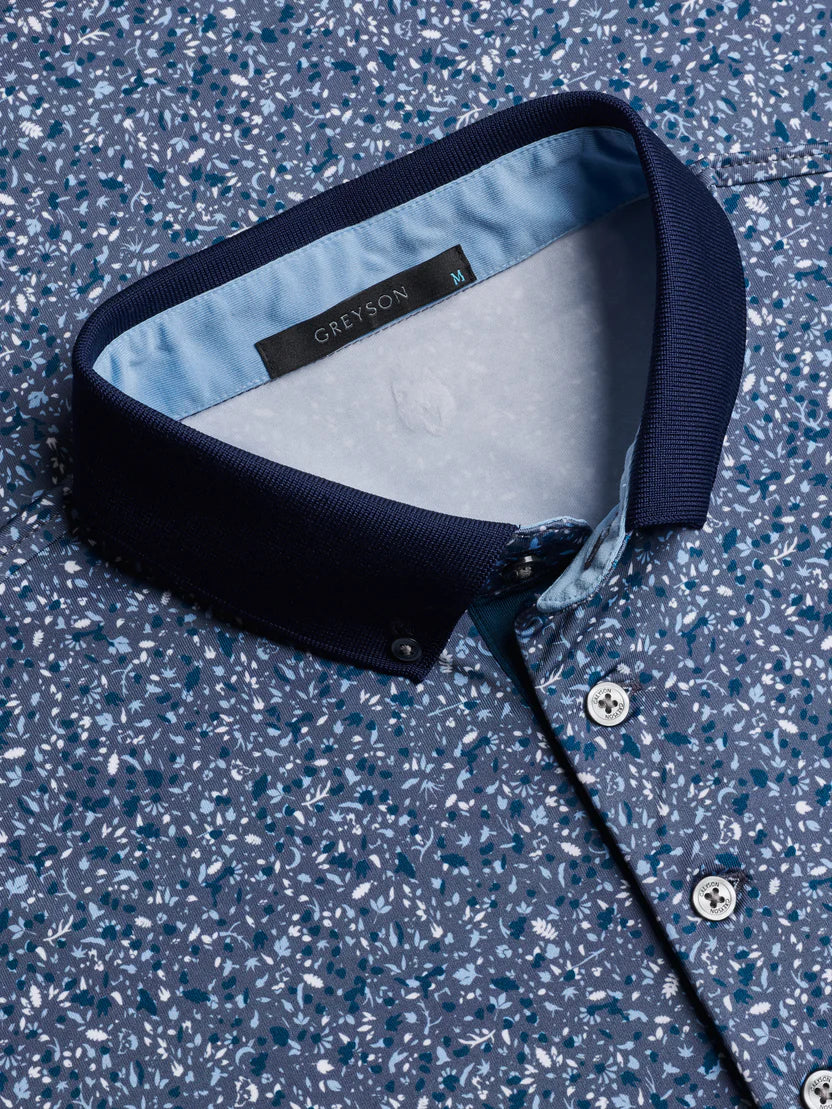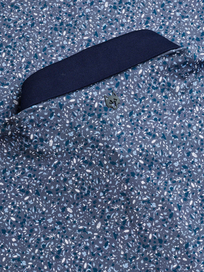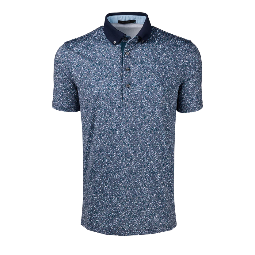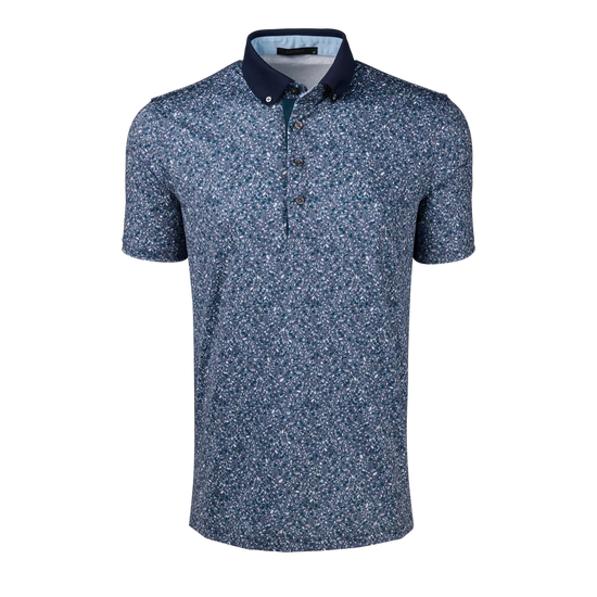 The Angel Tears Polo is elevated by a beautiful all-over pattern that offers a refined touch. Crafted from breathable performance fabric, it delivers stretch, moisture control, and lightweight comfort throughout the day. Designed for versatility, it transitions easily from the course to social gatherings or casual workdays. This performance printed polo is finished with a contrast button-down knit Crowley collar, open cuffs, and a three-button placket with contrast facing.