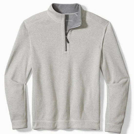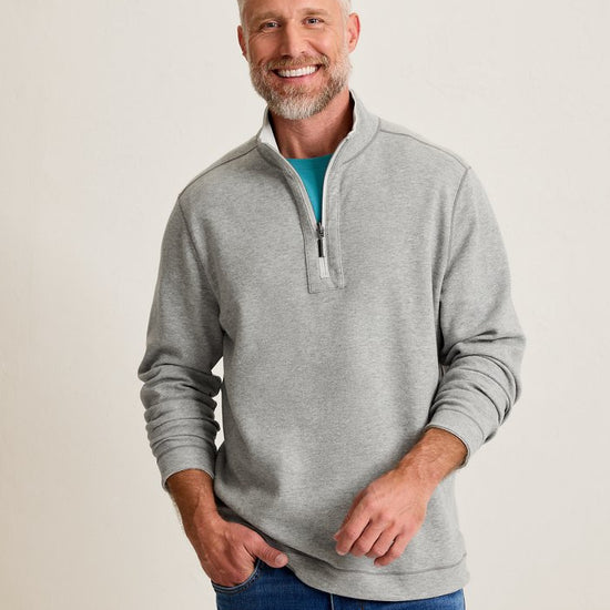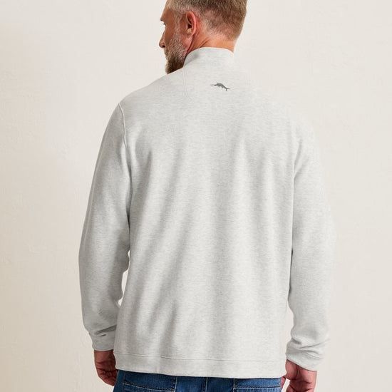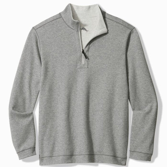 Tommy Bahama does it again with two half-zips in-one. This pullover is fully reversible and ready for you to change your look up at a moment's notice. Additionally it's got to be one of softest layering pieces around. Rich cotton pairs with modern performance materials to offer some comfort-enhancing stretch. Cover stitch detailing throughout also adds a touch of rugged style.