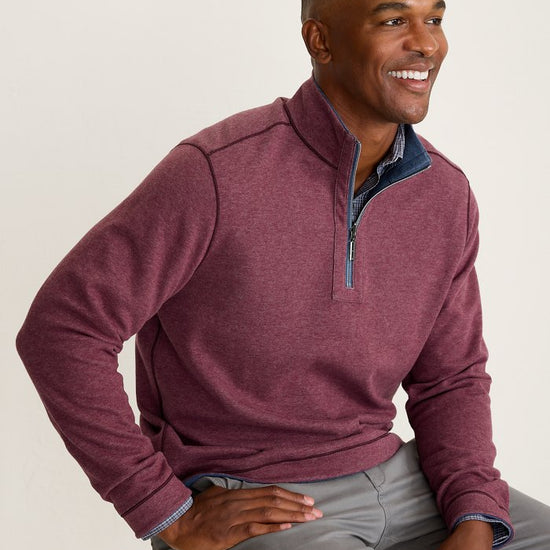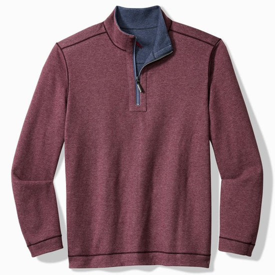 Tommy Bahama does it again with two half-zips in-one. This pullover is fully reversible and ready for you to change your look up at a moment's notice. Additionally, it's got to be one of softest layering pieces around. Rich cotton pairs with modern performance materials to offer some comfort-enhancing stretch. Cover stitch detailing throughout also adds a touch of rugged style.
