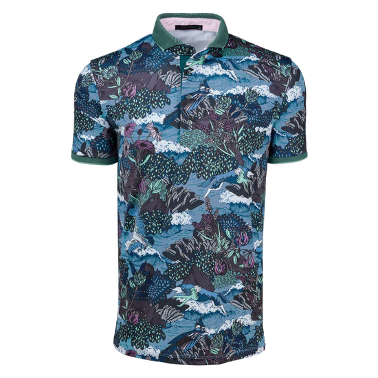The In The Waves Polo features an artistic print that brings a sense of movement and energy to a timeless silhouette. Crafted from breathable performance fabric, it offers natural stretch and quick-drying comfort for all-day wear. The pattern makes a statement yet is balanced, making it a standout piece that remains versatile. This performance printed polo is finished with a knit jacquard cutaway collar, matching cuffs, and a four-button placket with contrast detailing.