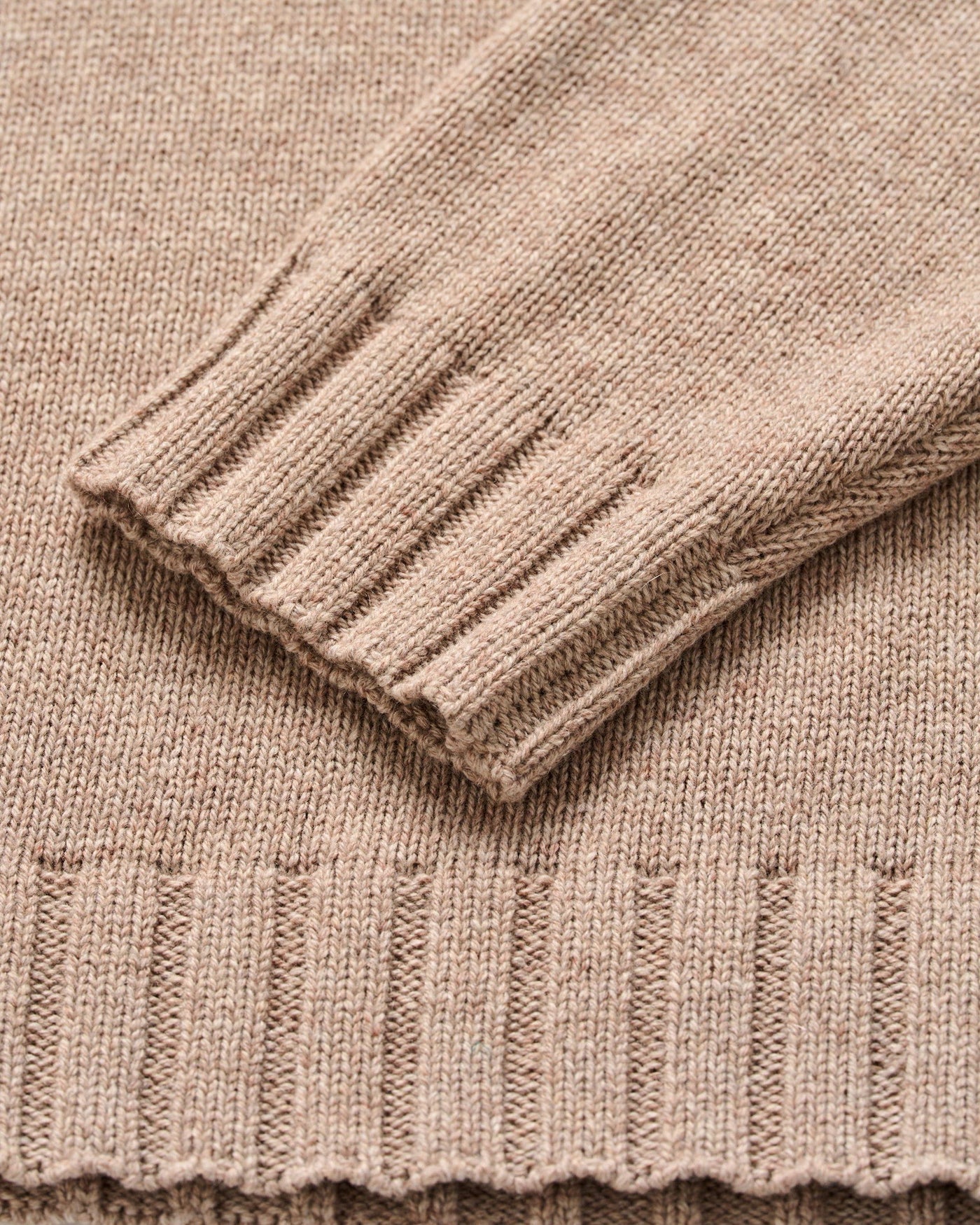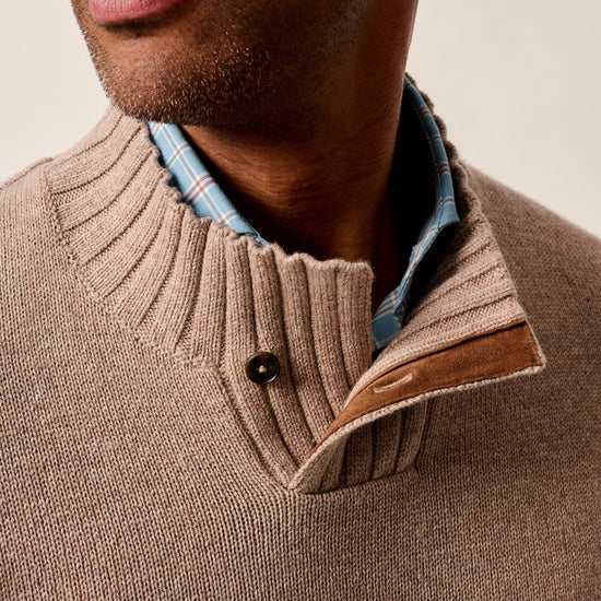 This classic sweater in a luxe blend of merino wool and cashmere is finished with a suede detail at the neck and horn buttons— true marks of quality.