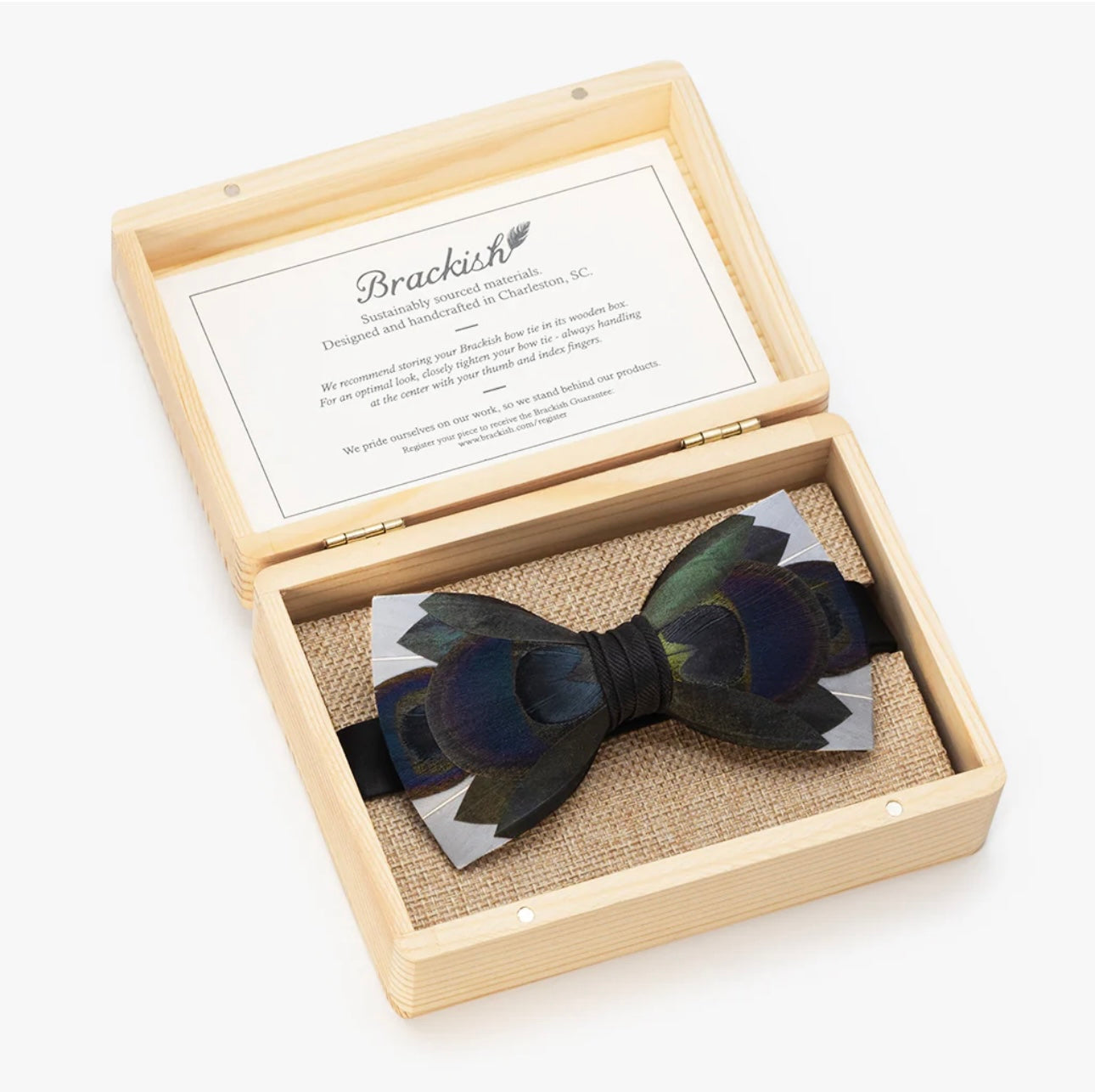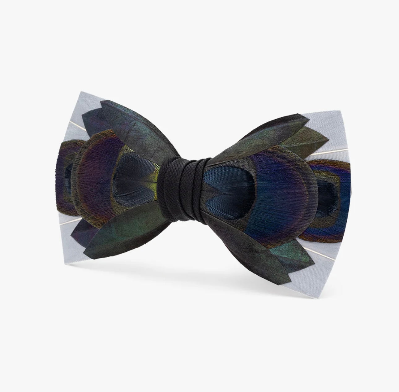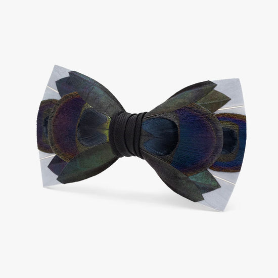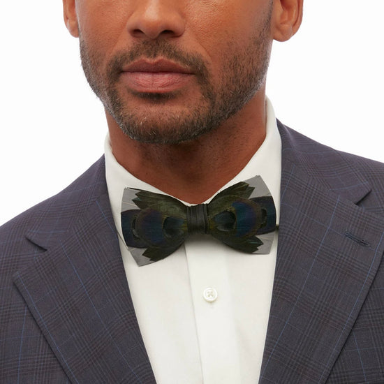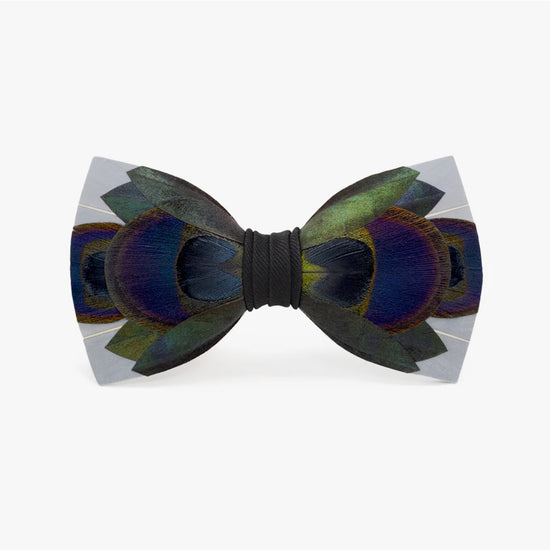 Rich hues of navy peacock and green rooster feathers are layered atop soft grey goose in this geometric bow tie, creating a balanced yet bold palette, perfect for fall.