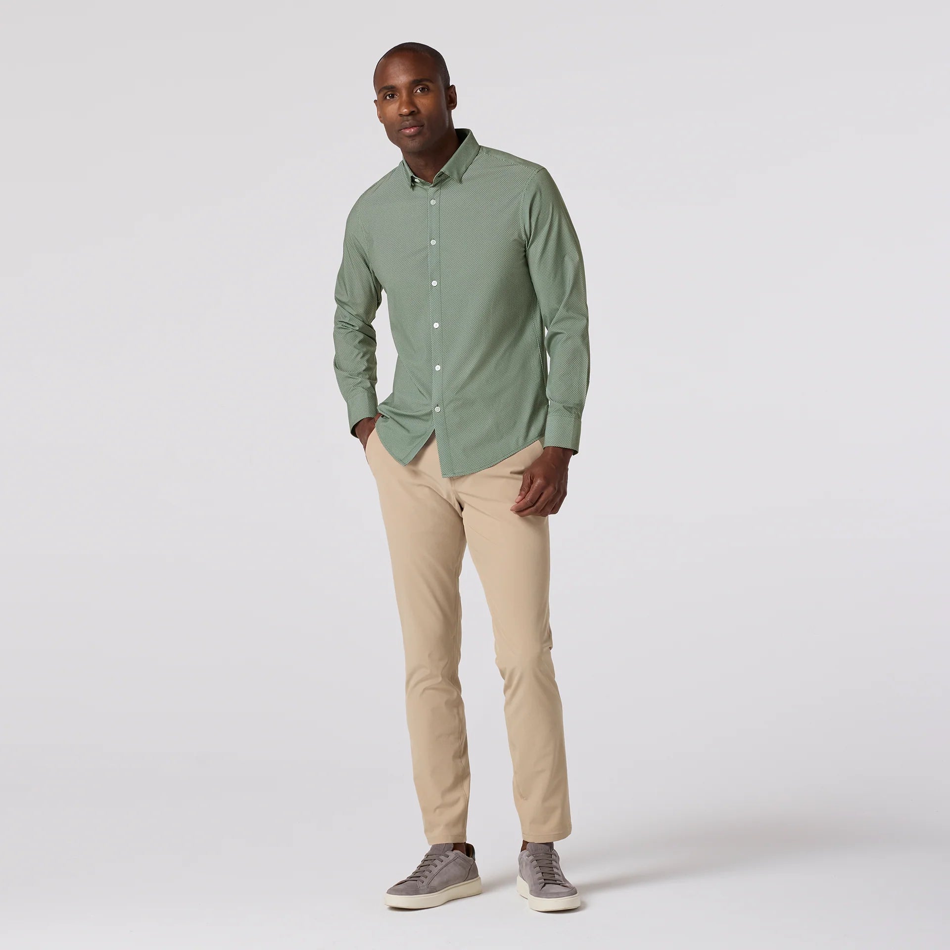 The Leeward is a lightweight, wrinkle-resistant performance dress shirt with built-in stretch. Designed for easy care, breathable comfort, and all-day wear—no dry cleaning needed.