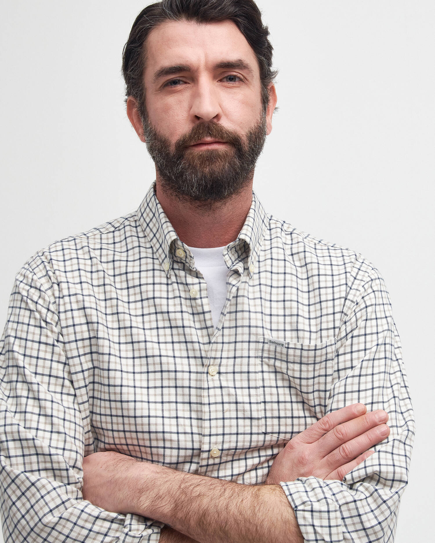 - Barbour and shield branded label positioned to top left of wearers chest pocket.