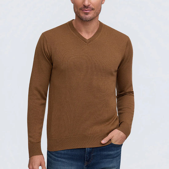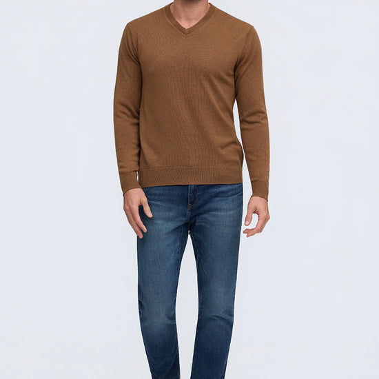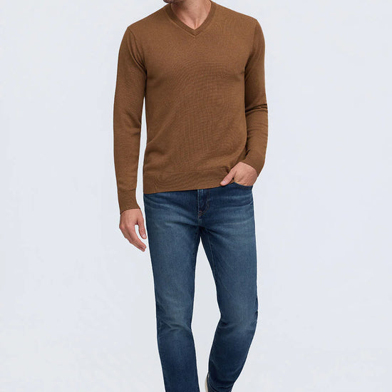 Made from 100% Extrafine Merino Wool this luxury V-neck sweater has a lightweight feel that is an all-year-round must-have. Available in an array of shades, The Bronson will not only add color to your wardrobe but also a refined sophistication.