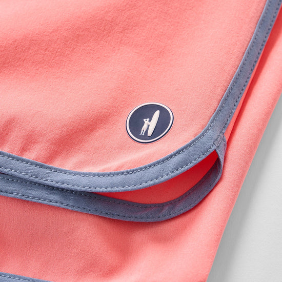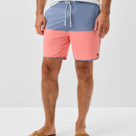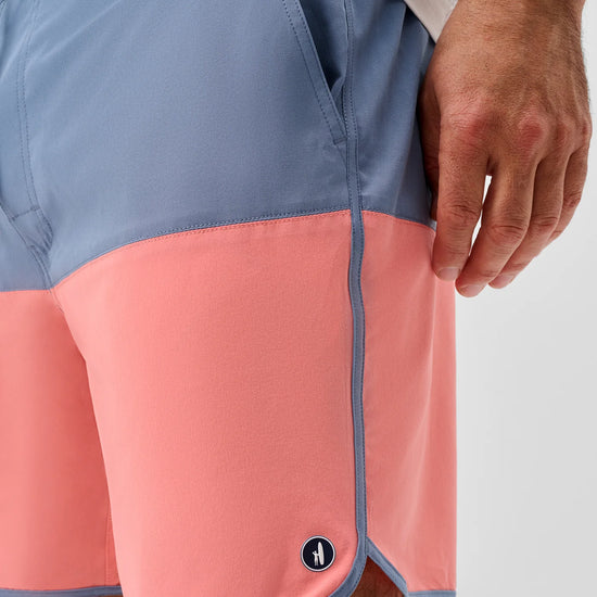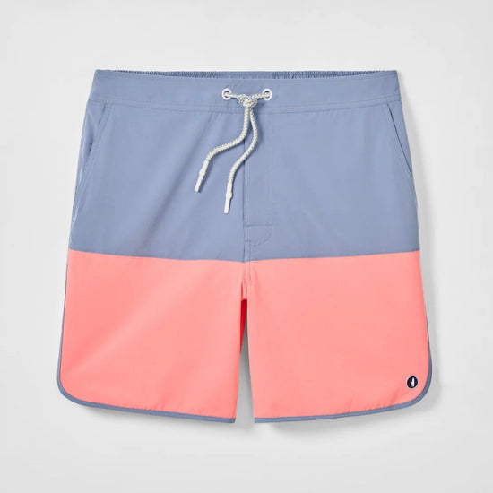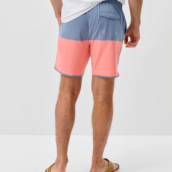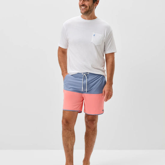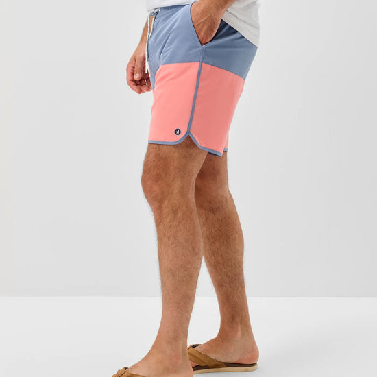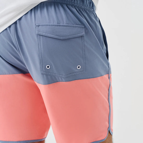 A retro style swim short ready for warmer days, the Tully features a cool color-blocked pattern and curved or "scalloped" bottom hem. This swim short is made with a quick drying fabric and soft netting to keep you comfortable all day long. The 7" inseam is designed to hit above the knee.