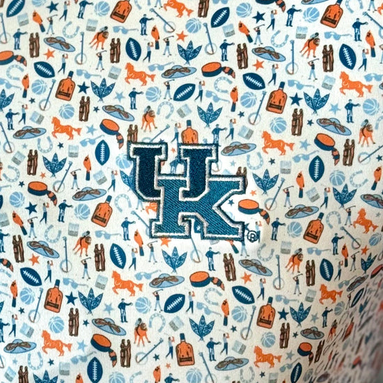The ultimate Kentucky Gameday polo! Featuring icons of Kentucky life, including football, basketball, horse racing, bourbon and more, with the UK logo embroidered on the chest in blue. "The Bluegrass" polo is available exclusively at Logan's!